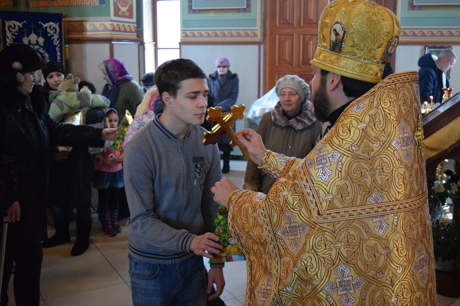 Молим тя, буди надежда всех христиан, верных защитель, алчущих кормитель, плачущих веселие, болящих врач, по морю плавающих управитель, убогих и сирых питатель и всем скорый помощник и покровитель, да мирное зде поживем житие и да сподобимся видети славу избранных Божиих на небеси, и с ними непрестанно воспевати единаго в Троице поклоняемого Бога во веки веков. Аминь.