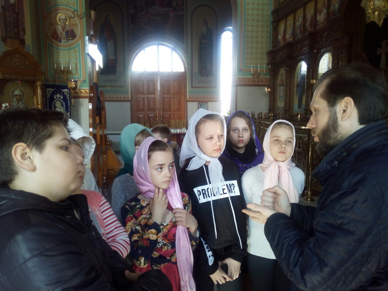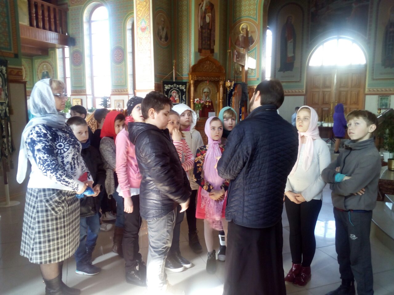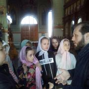 Батюшка дал детям предварительные понятия об устроении храма и его значении, ознакомил с понятием «икона». Наибольшее внимание было уделено иконе распятия Господа нашего и Спасителя Иисуса Христа, Сына Божия. Дети с большим вниманием слушали отца Андрея о спасительной жертве, страданиях и Воскресении нашего Спасителя, Который пострадал ради нас, принял смерть за наши грехи. Также отец Андрей рассказал о покровительнице нашего храма святой равноапостольной Марии Магдалине, которая стала первой благовестницей Христова Воскресения.