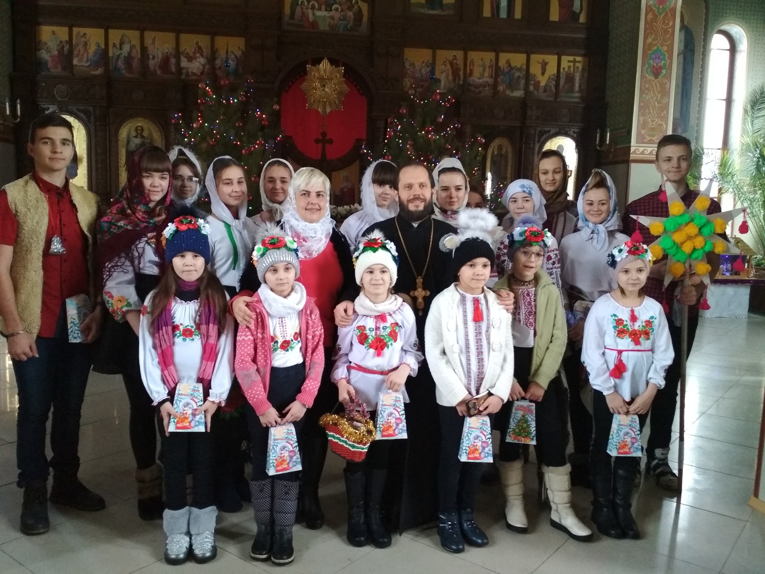 8 января после Божественной Литургии учащиеся Авдеевской общеобразовательной школы № 2 поздравили прихожан нашего храма с Рождеством Христовым и наступившим Новым годом. В исполнении школьного хора торжественно и празднично звучали колядки, новогодние песни и стихотворения. Дети прославляли величайшее событие - Рождество Христово, а  также всех главных лиц той ночи, которая принесла самую радостную, самую главную весть о рождении Спасителя мира! Настоятель храма протоиерей Андрей Карпец поблагодарил маленьких колядников и подарил им подарки.