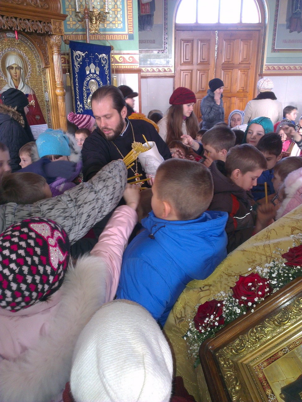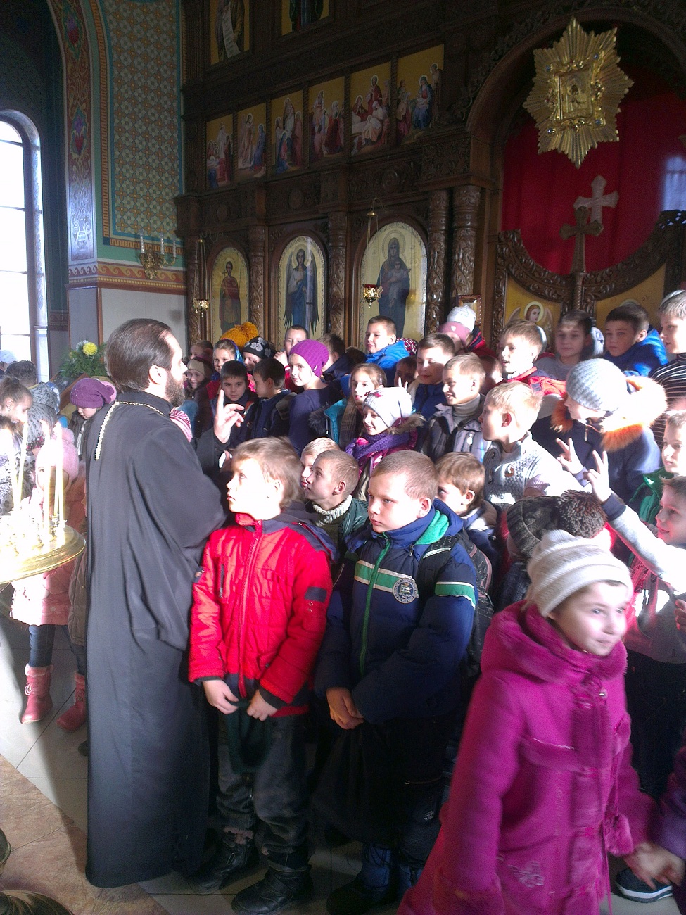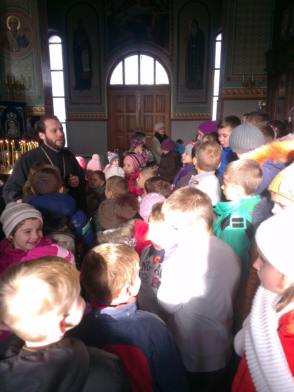 Ребят встретил настоятель храма протоиерей Андрей. Он выразил большую радость и отметил, что такое большое количество детей одновременно в нашем храме пребывает впервые. В виде интересной беседы батюшка ознакомил детей с основными понятиями. Он рассказал о предназначении храма, о том, как в Доме Божием можно разговаривать с Богом, что такое молитва и богослужение, какое значение имеет для нас Евангелие, какие дары мы можем получить от Господа. Батюшка в доступной форме рассказал детям о том, кто такие святые и что каждому человеку возможно приблизиться к святости, угождая ближним своими добрыми поступками. Основная часть беседы была посвящена непосредственно святителю Николаю - святому, житие которого наиболее показывает нам пример угождения Богу и ближнему посредством помощи, по возможности, всем нуждающимся. Отец Андрей обратил внимание детей на икону святителя Николая, рассказал, что означает его облачение, почему он держит в руке Евангелие и благословляет нас с иконы, как священник. Также батюшка научил маленьких гостей словам молитвы, с которой можно обращаться к Николаю Чудотворцу. Дети с интересом рассматривали икону святителя и произносили ему свои молитвы. Затем батюшка раздал детям свечи, рассказал, что означает горящая свеча, показал, как правильно поставить её на подсвечнике, предварительно осенив себя крестным знамением. Каждый ребёнок, возможно впервые в жизни, перекрестился и поставил свою свечу в храме.