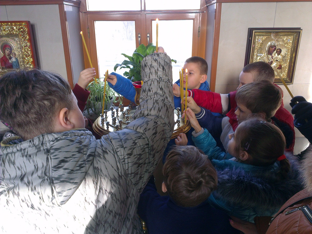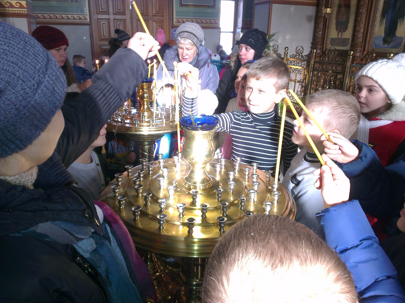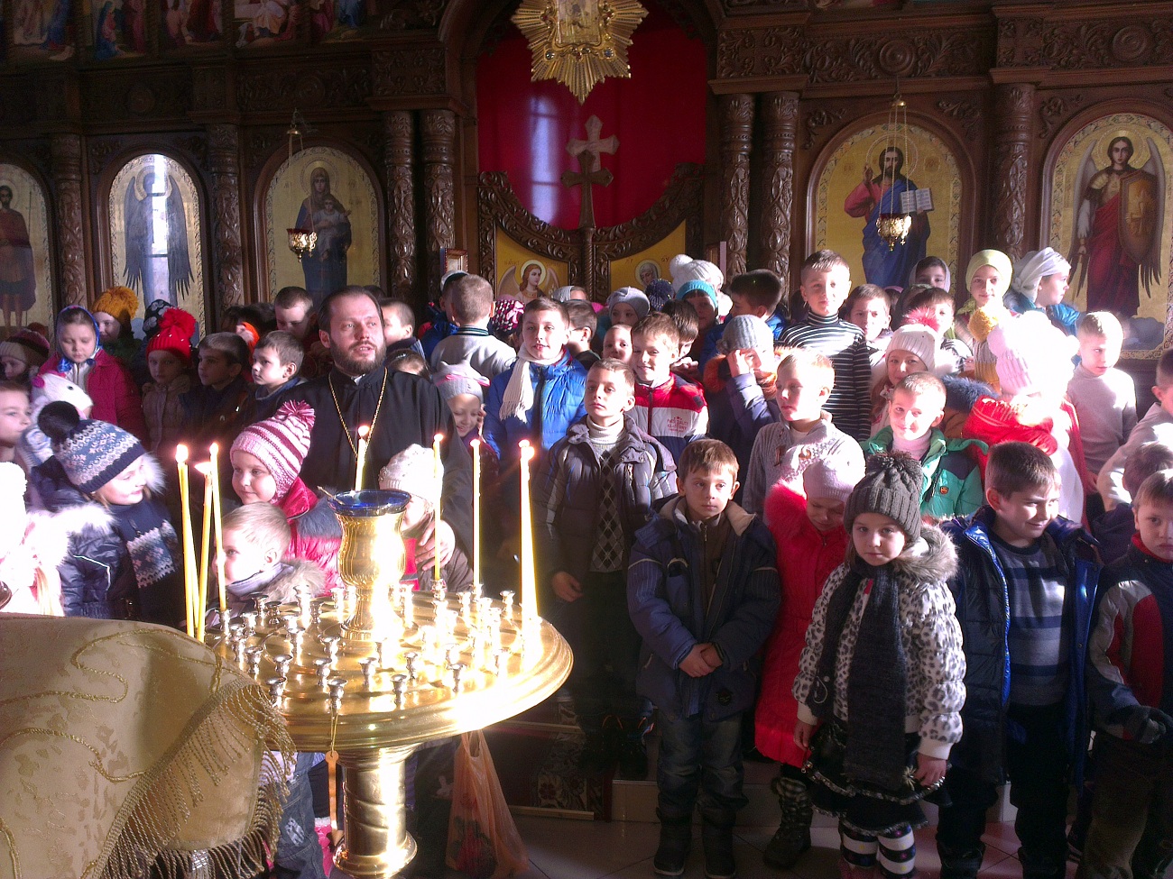 Ребят встретил настоятель храма протоиерей Андрей. Он выразил большую радость и отметил, что такое большое количество детей одновременно в нашем храме пребывает впервые. В виде интересной беседы батюшка ознакомил детей с основными понятиями. Он рассказал о предназначении храма, о том, как в Доме Божием можно разговаривать с Богом, что такое молитва и богослужение, какое значение имеет для нас Евангелие, какие дары мы можем получить от Господа. Батюшка в доступной форме рассказал детям о том, кто такие святые и что каждому человеку возможно приблизиться к святости, угождая ближним своими добрыми поступками. Основная часть беседы была посвящена непосредственно святителю Николаю - святому, житие которого наиболее показывает нам пример угождения Богу и ближнему посредством помощи, по возможности, всем нуждающимся. Отец Андрей обратил внимание детей на икону святителя Николая, рассказал, что означает его облачение, почему он держит в руке Евангелие и благословляет нас с иконы, как священник. Также батюшка научил маленьких гостей словам молитвы, с которой можно обращаться к Николаю Чудотворцу. Дети с интересом рассматривали икону святителя и произносили ему свои молитвы. Затем батюшка раздал детям свечи, рассказал, что означает горящая свеча, показал, как правильно поставить её на подсвечнике, предварительно осенив себя крестным знамением. Каждый ребёнок, возможно впервые в жизни, перекрестился и поставил свою свечу в храме.