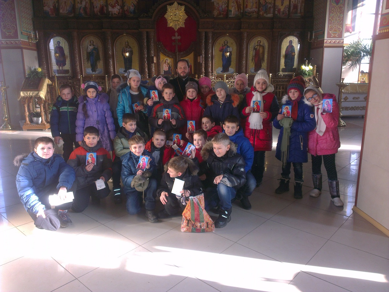 После небольшой фотосессии каждый маленький прихожанин получил от батюшки Андрея в подарок икону Божией Матери. Ребята, в свою очередь, подарили батюшке свои подарки и поблагодарили за очень интересный и полезный урок.