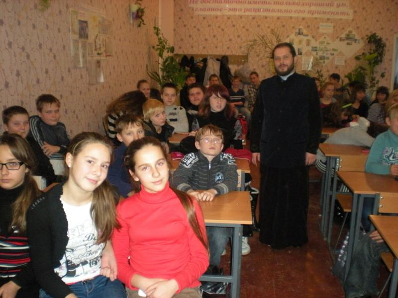 В ООШ № 5 г.Авдеевка, настоятель храма св. Марии Магдалины, протоиерей Андрей Карпец, провел урок с учениками 7-х классов. Тема урока: "Заповеди Божьи". На жизненных примерах священник объяснил значение Заповедей Божьих и как ими руководствоваться в повседневной жизни. Дети принимали активное участие в беседе задавая разные вопросы батюшке.