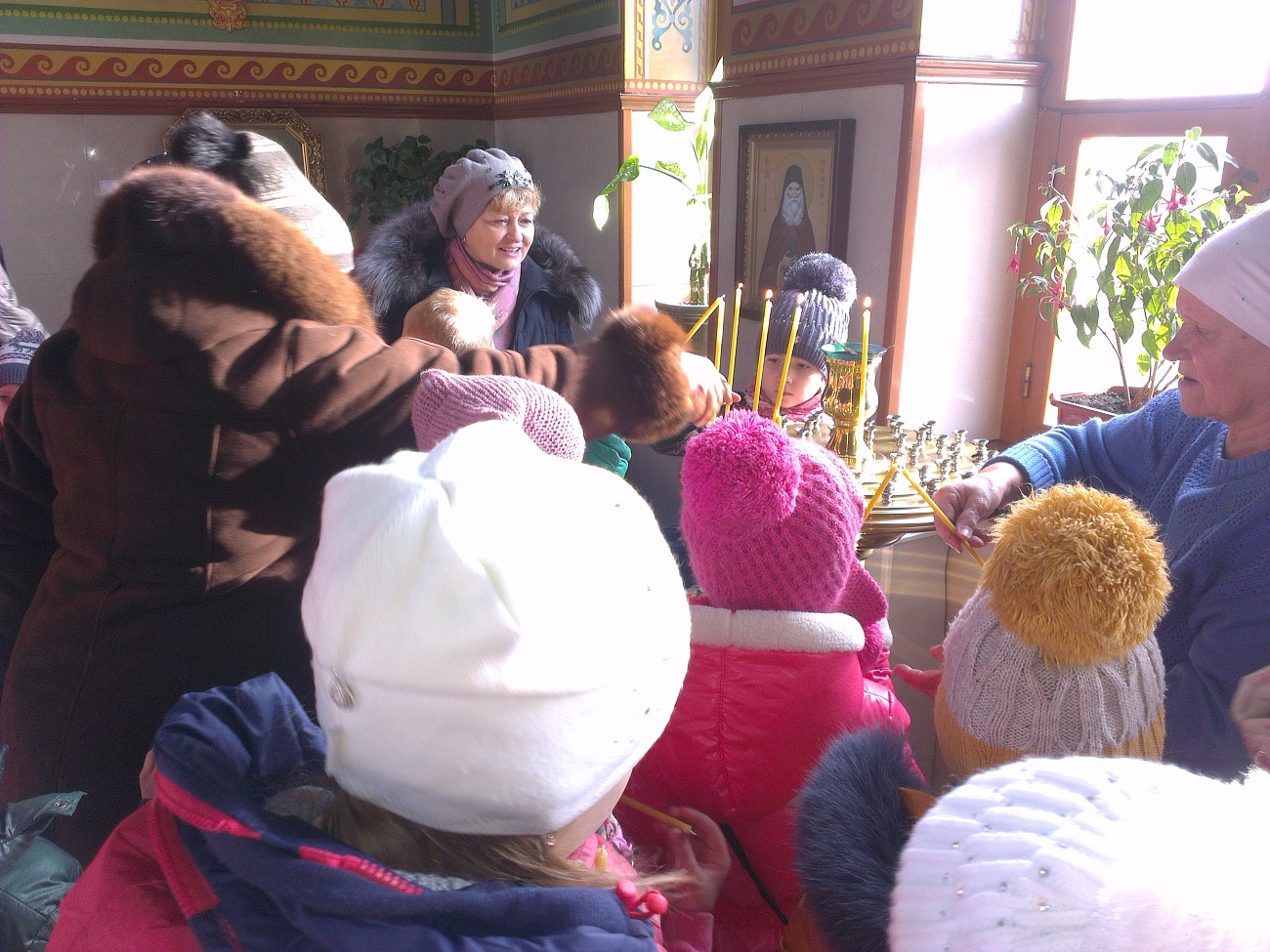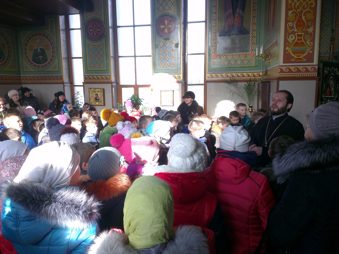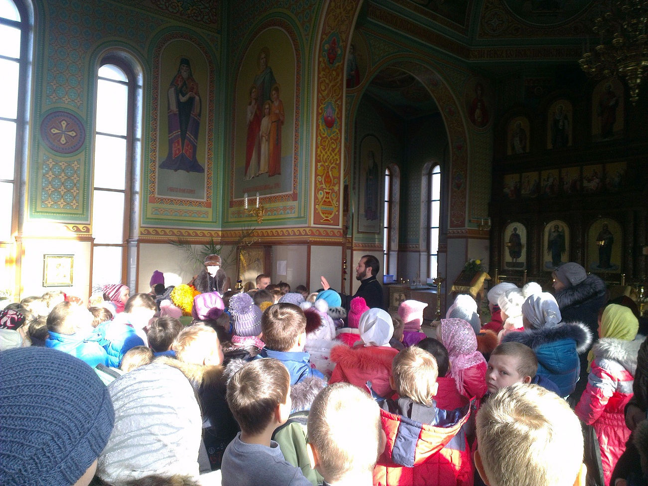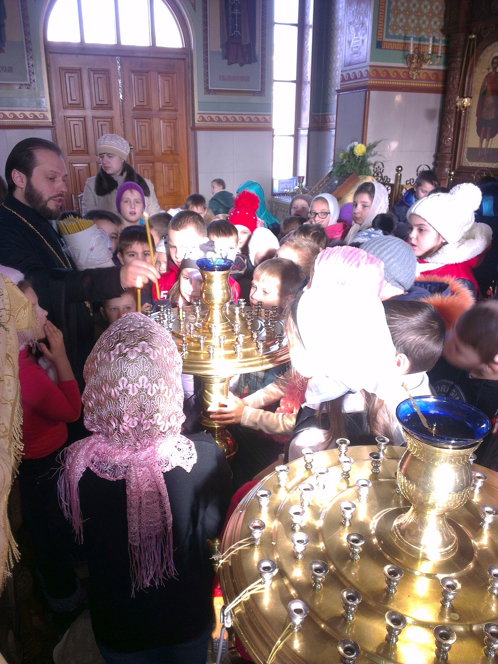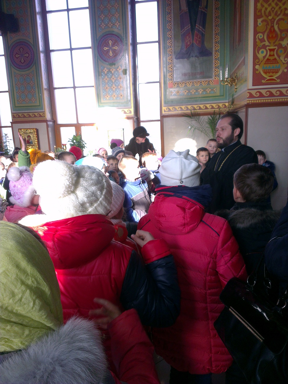 Ребят встретил настоятель храма протоиерей Андрей. Он выразил большую радость и отметил, что такое большое количество детей одновременно в нашем храме пребывает впервые. В виде интересной беседы батюшка ознакомил детей с основными понятиями. Он рассказал о предназначении храма, о том, как в Доме Божием можно разговаривать с Богом, что такое молитва и богослужение, какое значение имеет для нас Евангелие, какие дары мы можем получить от Господа. Батюшка в доступной форме рассказал детям о том, кто такие святые и что каждому человеку возможно приблизиться к святости, угождая ближним своими добрыми поступками. Основная часть беседы была посвящена непосредственно святителю Николаю - святому, житие которого наиболее показывает нам пример угождения Богу и ближнему посредством помощи, по возможности, всем нуждающимся. Отец Андрей обратил внимание детей на икону святителя Николая, рассказал, что означает его облачение, почему он держит в руке Евангелие и благословляет нас с иконы, как священник. Также батюшка научил маленьких гостей словам молитвы, с которой можно обращаться к Николаю Чудотворцу. Дети с интересом рассматривали икону святителя и произносили ему свои молитвы. Затем батюшка раздал детям свечи, рассказал, что означает горящая свеча, показал, как правильно поставить её на подсвечнике, предварительно осенив себя крестным знамением. Каждый ребёнок, возможно впервые в жизни, перекрестился и поставил свою свечу в храме.