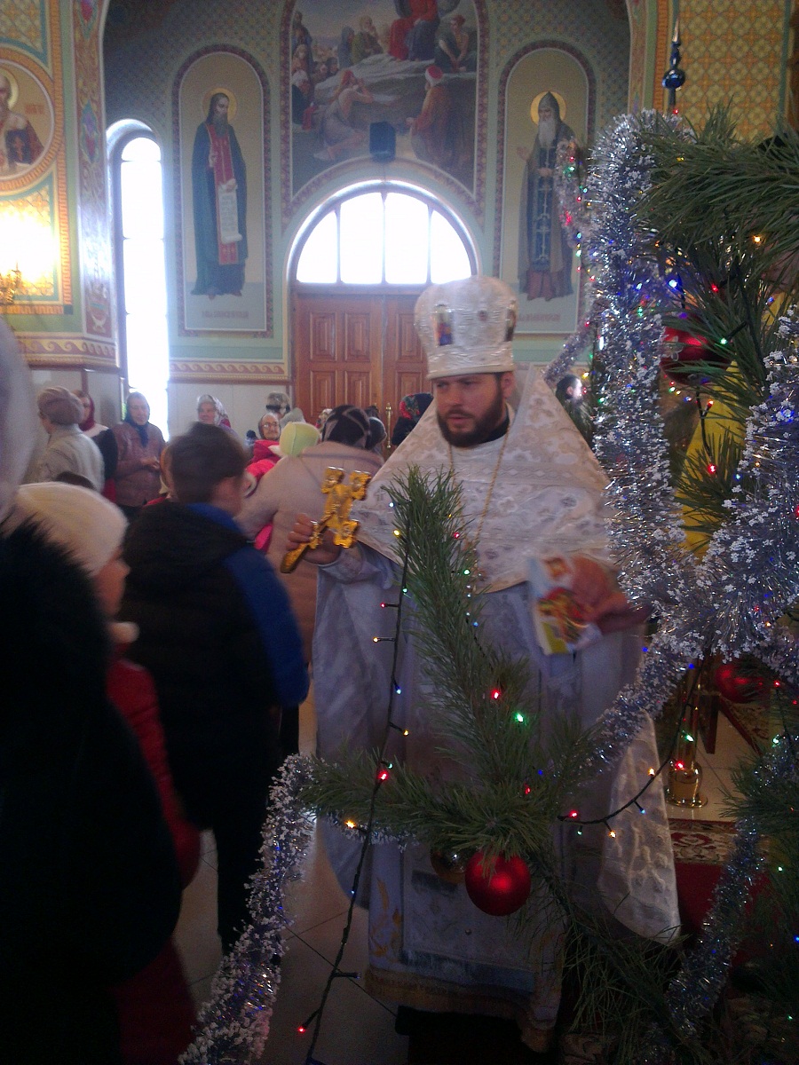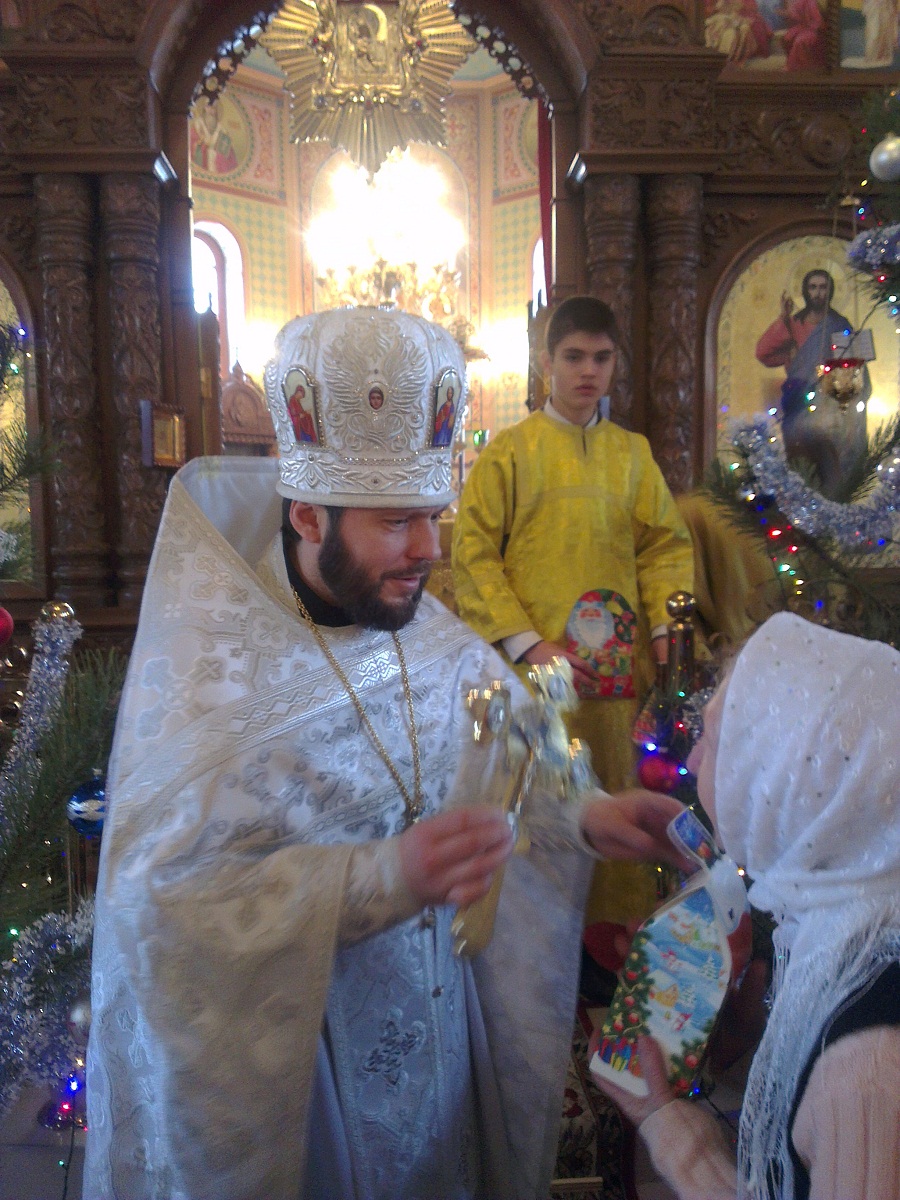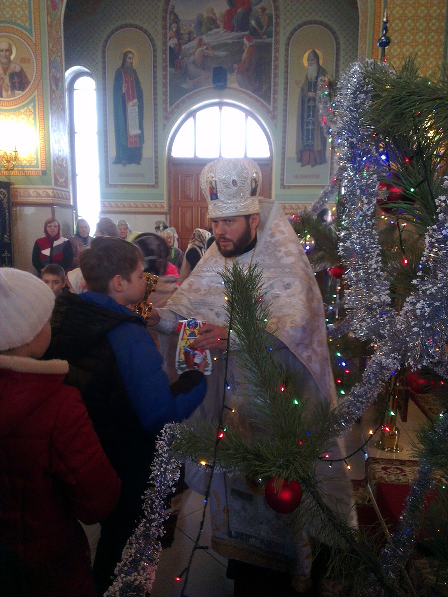 На Божественную Литургию в наш храм пришло множество людей, чтобы прославить Господа, поклониться Новорожденному Богомладенцу, причаститься Святых Христовых Тайн. Настоятель храма протоиерей Андрей Карпец поздравил всех прихожан с великим и радостным праздником. По окончании Божественной Литургии батюшка поблагодарил всех за совместную молитву и раздал прихожанам сладкие подарки.