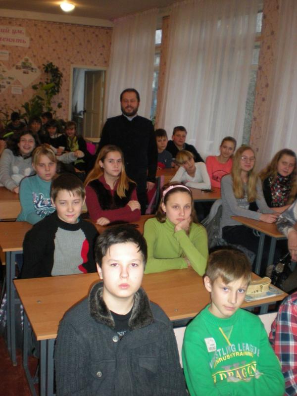 В ООШ № 5 г.Авдеевка, настоятель храма св. Марии Магдалины, протоиерей Андрей Карпец, провел урок с учениками 7-х классов. Тема урока: "Заповеди Божьи". На жизненных примерах священник объяснил значение Заповедей Божьих и как ими руководствоваться в повседневной жизни. Дети принимали активное участие в беседе задавая разные вопросы батюшке.